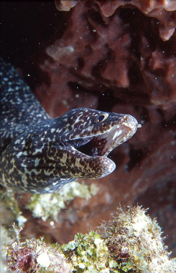 Spotted Moray by Mark Webster at Off The Wall, Glovers Atoll, Belize