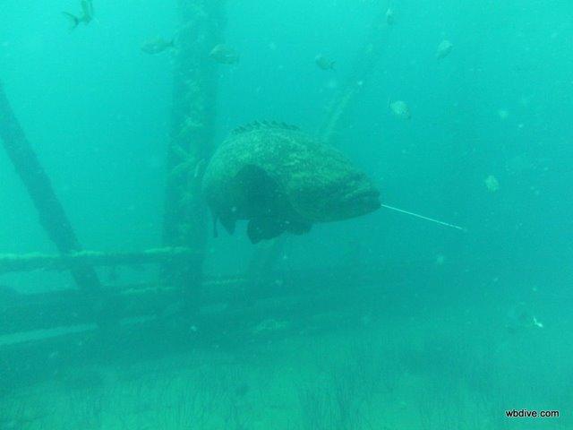 Goliath Grouper w/ a spear shaft sticking out of his mouth